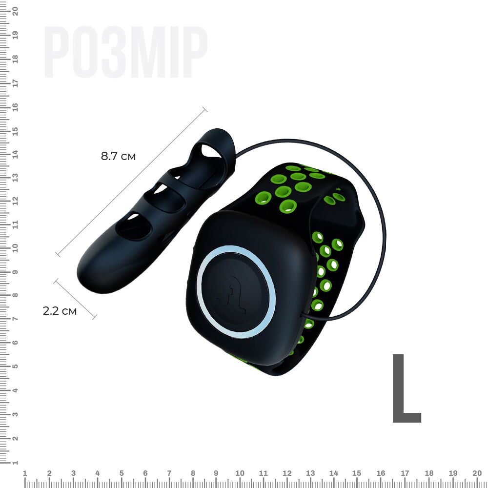 Пульт управления и зарядка находятся на специальном браслете, который элегантно крепится на запястье и соединяется с самой насадкой силиконовым шнурком, что обеспечивает фиксацию насадки на пальце. Благодаря этому нам удалось максимально уменьшить размер самой насадки, что делает её более удобной и манёвренной. Вся вибрация сконцентрирована на кончике пальца. Всего 10 режимов вибрации, который вы переключаете, нажимая кнопку на браслете.