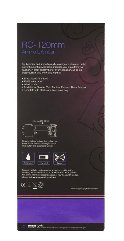 Предлагаем купить вибратор Rocks Off RO-120mm 10. Эта изящная вибропуля калибра 120 мм отнюдь не дура, она бьет точно в цель — оргазм за оргазмом. Ее гладкая на ощупь поверхность будет нежно скользить по вашему разгоряченному телу, глубоко проникая вглубь самых интимных желаний. 10 режимов вибрации — это 10 точных попаданий, способные удовлетворить самую жаркую страсть и неутолимую сексуальную жажду.
