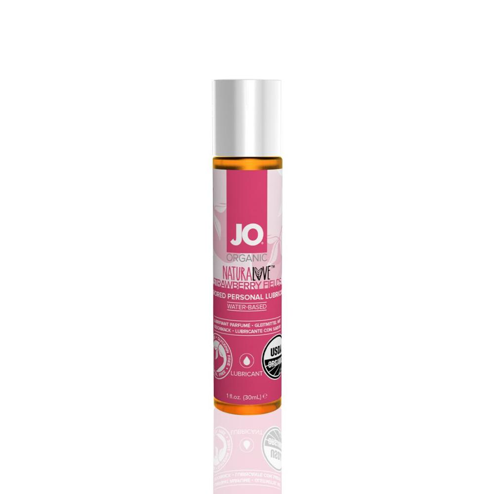 Лубрикант на водной основе JO NATURALOVE — STRAWBERRY, «Клубничные поля» — ароматизированный интимный лубрикант, созданный для получения большего удовольствия от прелюдии и интимной близости. Это средство характеризуется содержанием более чем 95 % сертифицированных органических ингредиентов. Консервант из ромашки придает приятную янтарную окраску, а агава — гладкое скольжение.