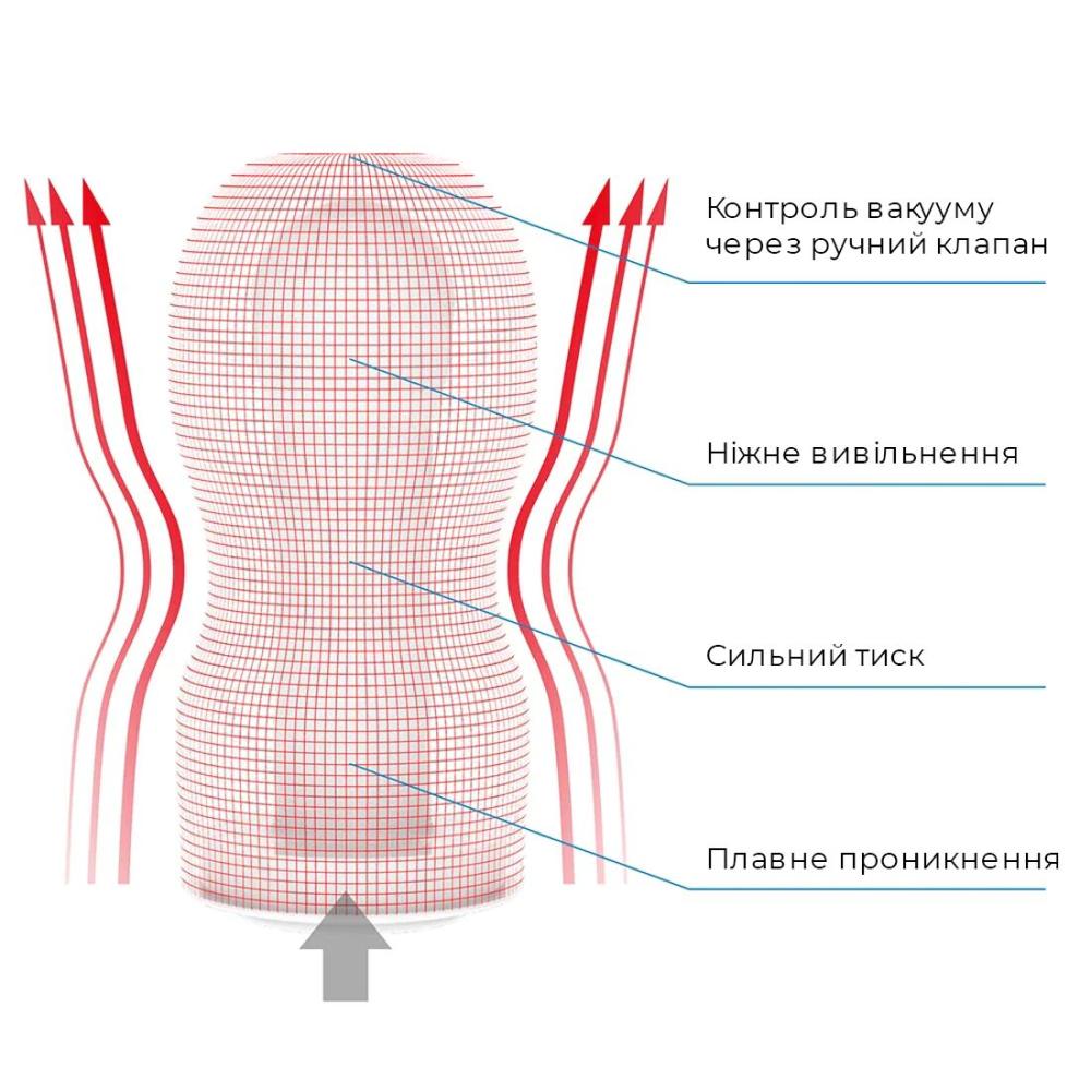оснащен специальными камерами с клапанами, которые при использовании мастурбатора создают перепады давления, обеспечивая реальный эффект сосания;
