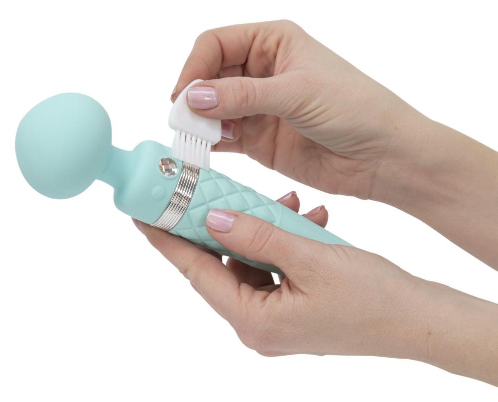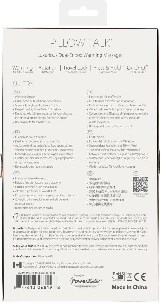 Предлагаем купить вибромассажер PILLOW TALK - Sultry Teal — роскошный массажер улучшенной формы с функцией нагрева и шикарным украшением — настоящим кристаллом Swarovski. Элегантный дизайн, удобное управление и двойное использование (вибрация головки + ротация ручки) — этот вибромассажер создан для наивысшего удовольствия.