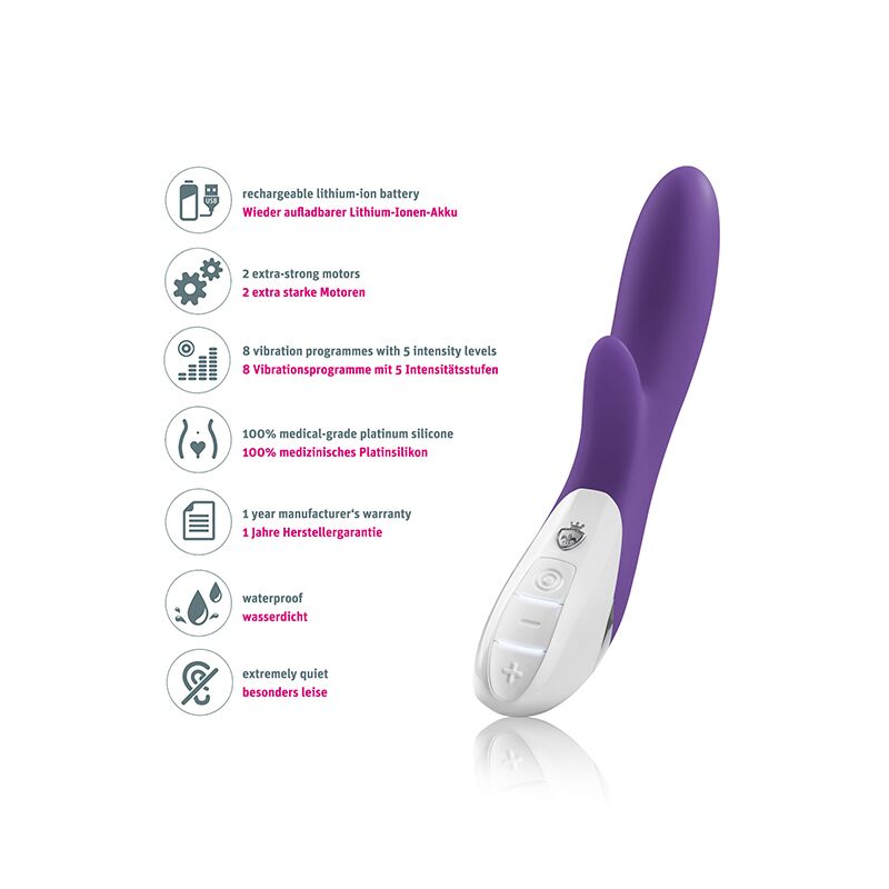 Аккуратный вибратор небольшого диаметра всегда готов вас развлечь! Выбирайте то, чего хочется в данный момент: сладострастного удовольствия, растянутого на часы, или мощного взрывного оргазма. Два двигателя — в вводимой части и в отростке — будут работать попеременно или одновременно в 8 захватывающих программах вибрации и 5 вариантах интенсивности. Работа вибратора мощная, но абсолютно тихая: вас ничего не выдаст, кроме стона наслаждения…