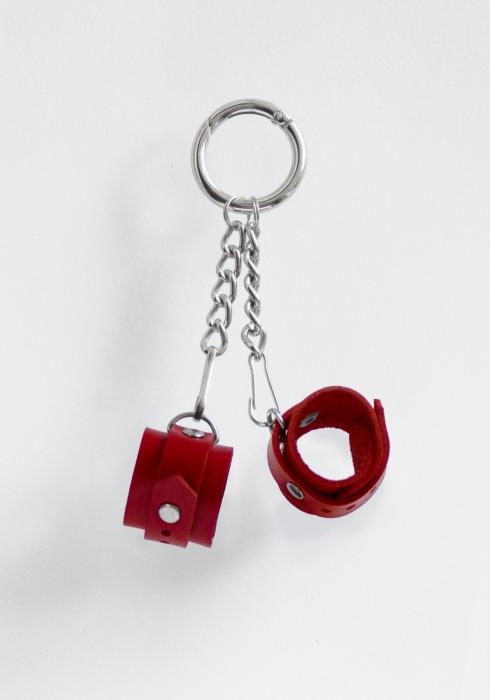Мини-наручники из натуральной кожи растительного дубления, украшены хольнитенами (заклепками). Каждый наручник крепится к основному кольцу-карабину цепочкой и мини-карабином, поэтому можно носить только один наручник, а второй — подарить своему партнеру в качестве символа.