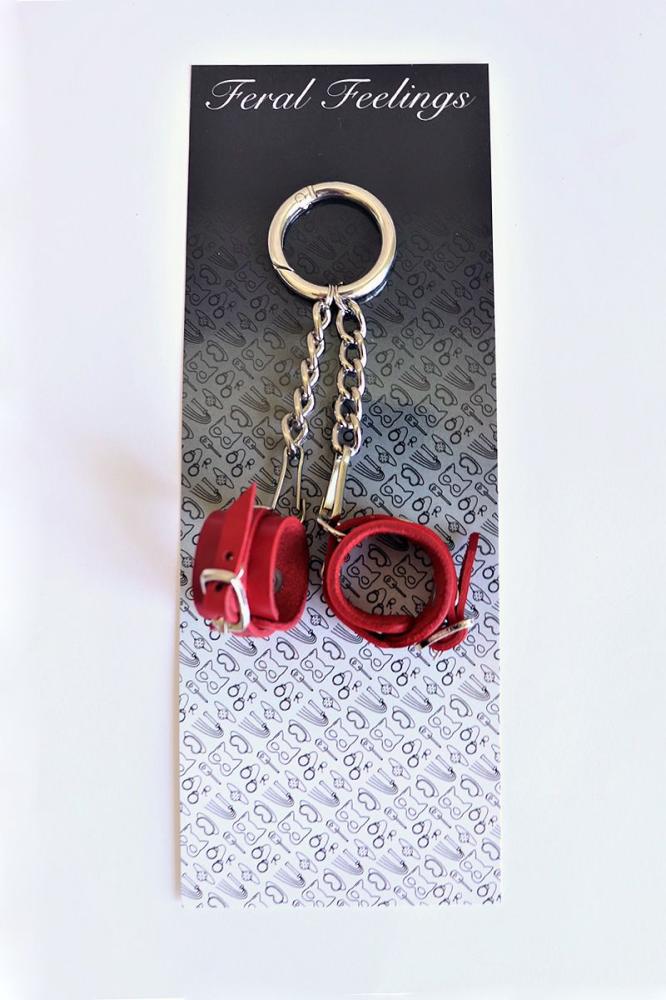 Миниатюрная версия наручников изготовлена из натуральной кожи растительного дубления. Каждый наручник крепится к основному кольцу-карабину цепочкой и мини-карабином, поэтому можно носить только один наручник, а второй — подарить своему партнеру в качестве символа.