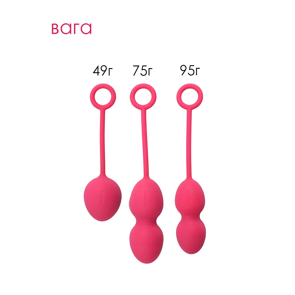 Предлагаем купить набор вагинальных шариков со смещенным центром тяжести Svakom Nova Plum Red — уникальный интимный аксессуар, который поможет укрепить вагинальные мышцы, повысить упругость стенок влагалища, усилить удовольствие во время близости, а также — восстановиться после родов. В набор входит три тренажера разного диаметра и массы для прогрессивных тренировок. Нестабильный центр тяжести — перекатывающийся внутри шарик — повышает эффективность занятий и добавляет приятных ощущений!