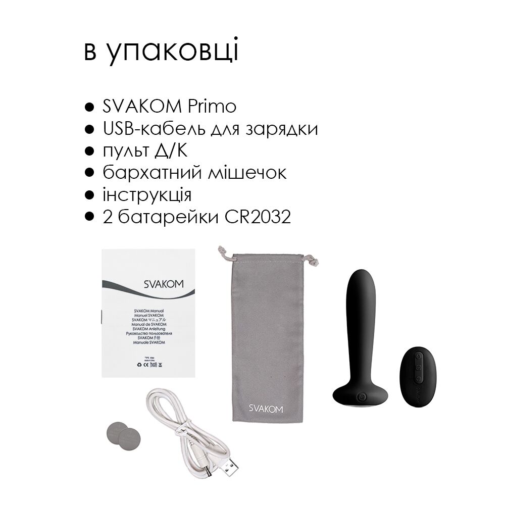 В упаковке: SVAKOM Primo + пульт Д/У + бархатный мешочек + инструкция + USB-кабель для зарядки + 2 батарейки CR2032.