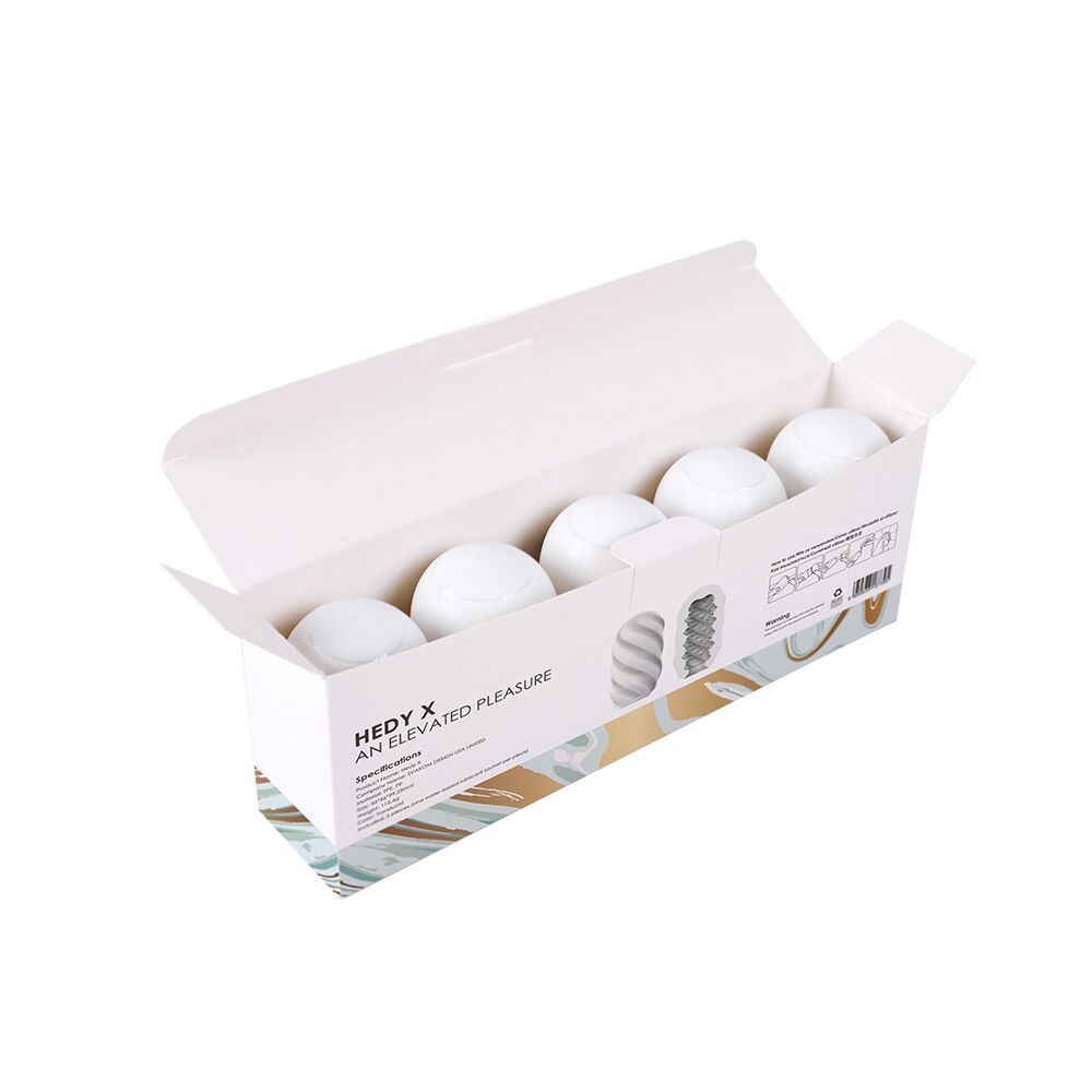 Яйца изготовлены из утолщенного ультра мягкого TPE для максимально ярких ощущений. Более упругие, чем стандартные Hedy! Материал полностью безопасный для тела. В набор яиц мастурбаторов Svakom Hedy X Control входит сразу 5 компактных яиц с удивительной внутренней и наружной текстурой. Выпуклости, расположенные по спирали, будут интенсивно стимулировать пенис, а наружная текстура яйца будто состоит из множества тончайших слоев, уложенных по спирали, что обеспечивает супер чувствительные прикосновения.