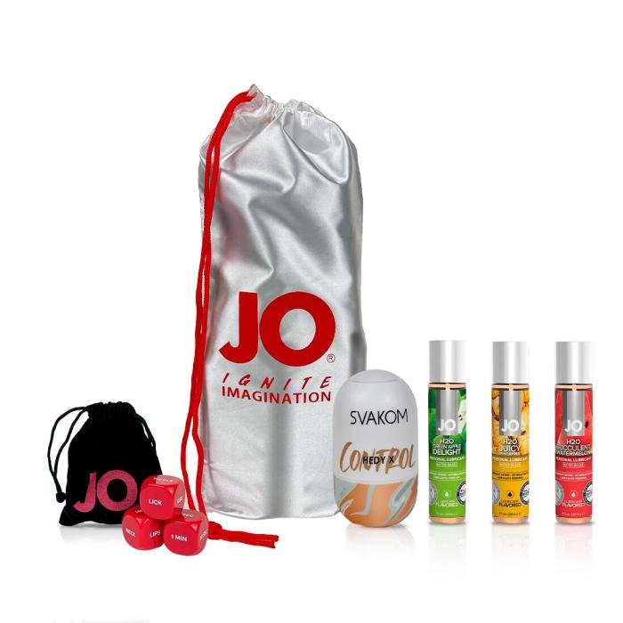 Предлагаем купить набор «Сочный фрукт» — отличный вариант романтичного подарка, который можно сразу опробовать! Сразу три вкусных лубриканта (вкус яблока, ананаса и арбуза), яйцо-мастурбатор и игральные кубики для возбуждающей прелюдии — все детали этого набора подобраны просто идеально. Кубики помогут вам узнать получше сексуальные предпочтения друг друга и привнесут элемент игры в вашу близость. Набор упакован в подарочный атласный мешочек System JO.