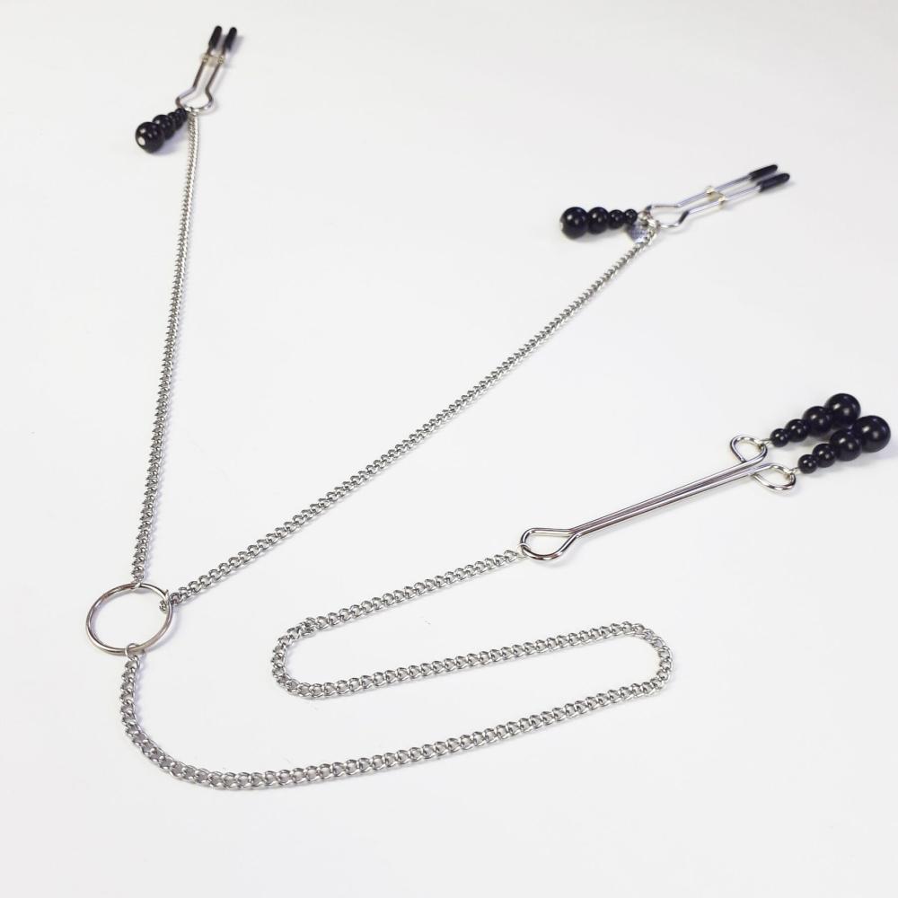 Да, в интимных украшениях тоже есть свои тенденции и модные веяния. Зажимы соединены между собой тонкой металлической цепочкой и украшены черными декоративными жемчужинами. Безопасную эксплуатацию обеспечивают мягкие силиконовые накладки.