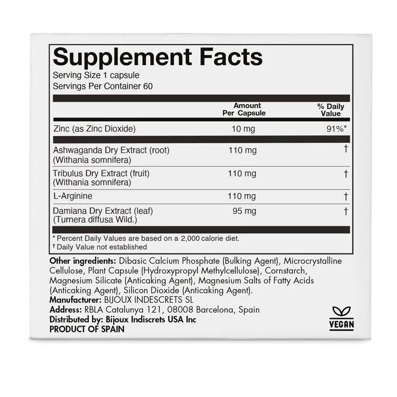 Основной состав: диоксид цинка, сухой экстракт корня ашвагандхи, сухой экстракт плодов трибулуса земляного (якорцев), L-аргинин, сухой экстракт листьев дамианы.