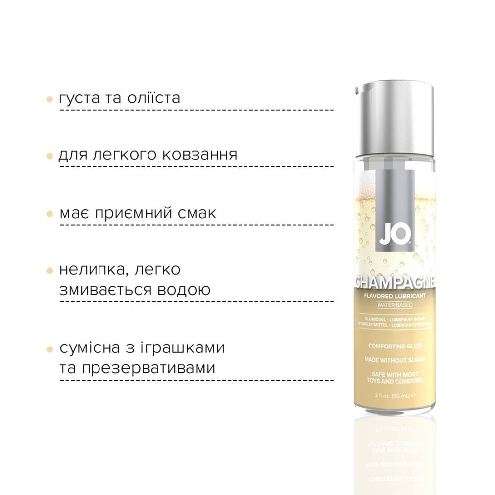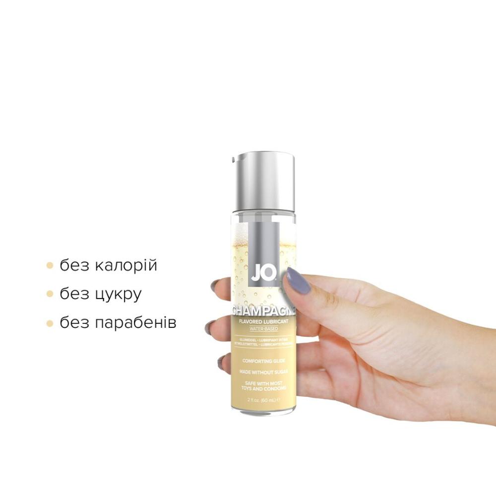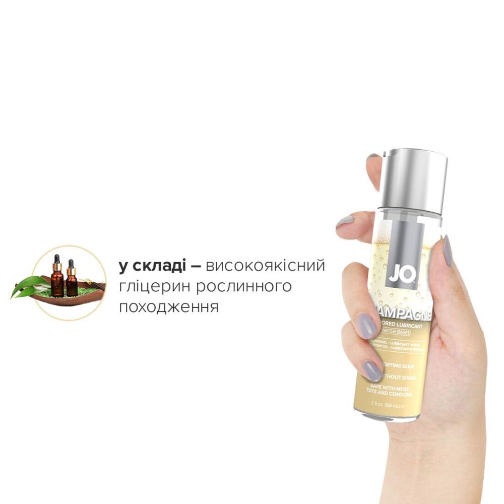 Состав JO Champagne: вода, растительный глицерин, сорбат калия, гидроксиэтилцеллюлоза, ароматизатор, сукралоза, хлорид натрия, лимонная кислота.