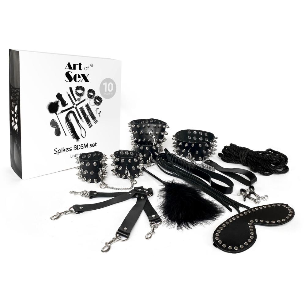 БДСМ-набор Art of Sex – Spikes BDSM Set Leather из натуральной кожи включает в себя 10 элементов. Аксессуары украшены фурнитурой в виде заклепок и шипов, надежно крепятся и не травмируют кожу. Качественные девайсы обеспечат вам приятные ощущения во время сессии, а надежная металлическая фурнитура сделает ваши практики комфортными и безопасными. Благодаря дерзкому дизайну ваш сабмиссив может почувствовать себя животным, которое обуздал тиранический Хозяин.