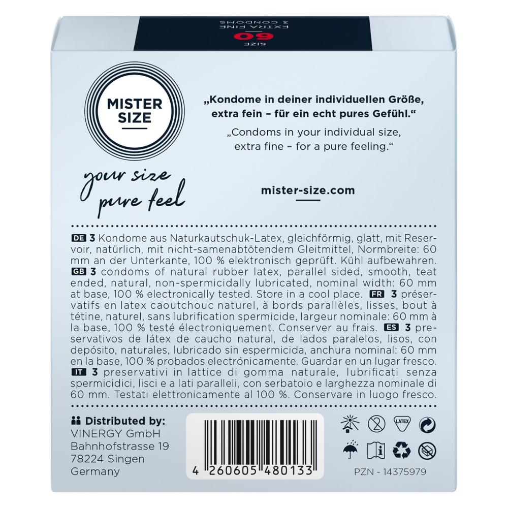 Презерватив без презерватива — только естественные ощущения во время близости! Предлагаем купить презервативы Mister Size - pure feel - 60, изготовленные из тончайшего каучукового латекса. Толщина стенок презерватива всего 0,05 мм, при этом он достаточно прочный, чтобы не порваться в ответственный момент, что обеспечивает надежную защиту от нежелательной беременности и ЗППП. Презервативы покрыты силиконовой смазкой, легко надеваются и снабжены понятной иллюстрированной инструкцией. Главное, правильно подобрать размер и наслаждаться качественным сексом!