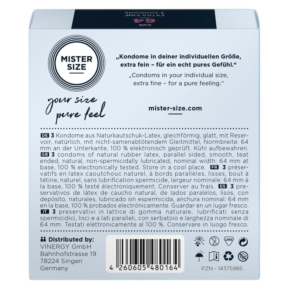 Презерватив без презерватива — только естественные ощущения во время близости! Предлагаем купить презервативы Mister Size - pure feel - 64, изготовленные из тончайшего каучукового латекса. Толщина стенок презерватива всего 0,05 мм, при этом он достаточно прочный, чтобы не порваться в ответственный момент, что обеспечивает надежную защиту от нежелательной беременности и ЗППП. Презервативы покрыты силиконовой смазкой, легко надеваются и снабжены понятной иллюстрированной инструкцией. Главное, правильно подобрать размер и наслаждаться качественным сексом!