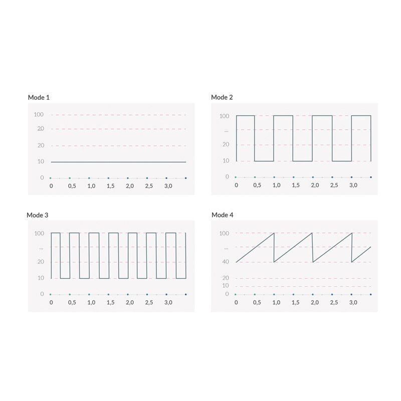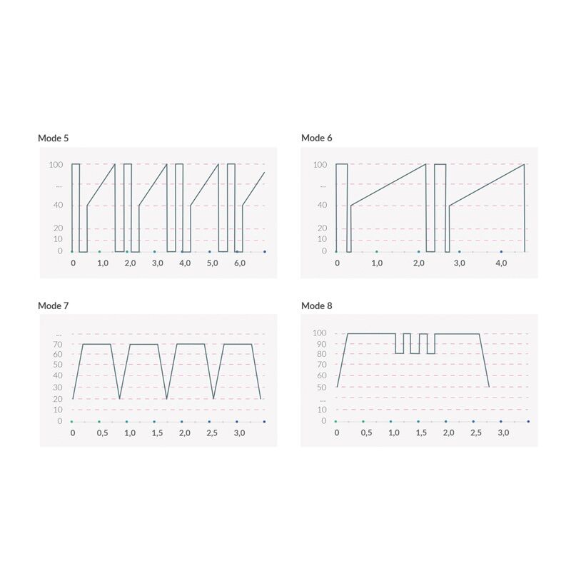 5 паттернов электростимуляции: равномерные покалывания, покалывания с чередованием интенсивности, равномерная пульсация (импульсный ток), пульсация разной интенсивности, чередование покалывания и пульсации;