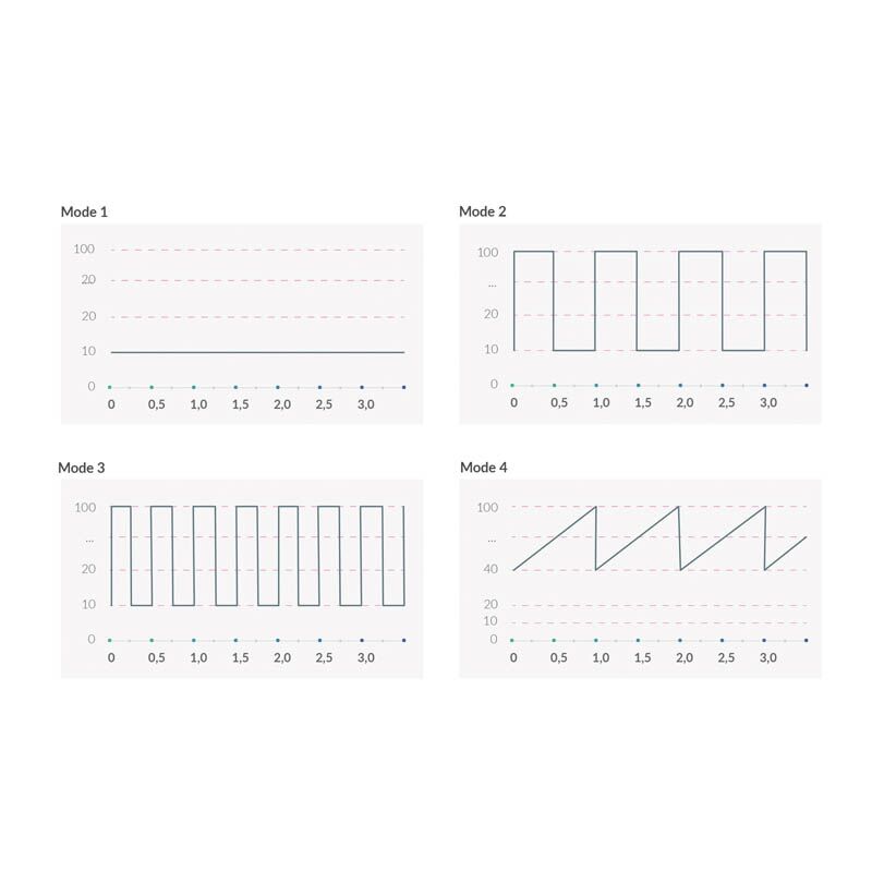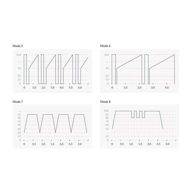 5 режимов электростимуляции: равномерные покалывания, покалывания с чередованием интенсивности, равномерная пульсация (импульсный ток), пульсация разной интенсивности, чередование покалывания и пульсации;