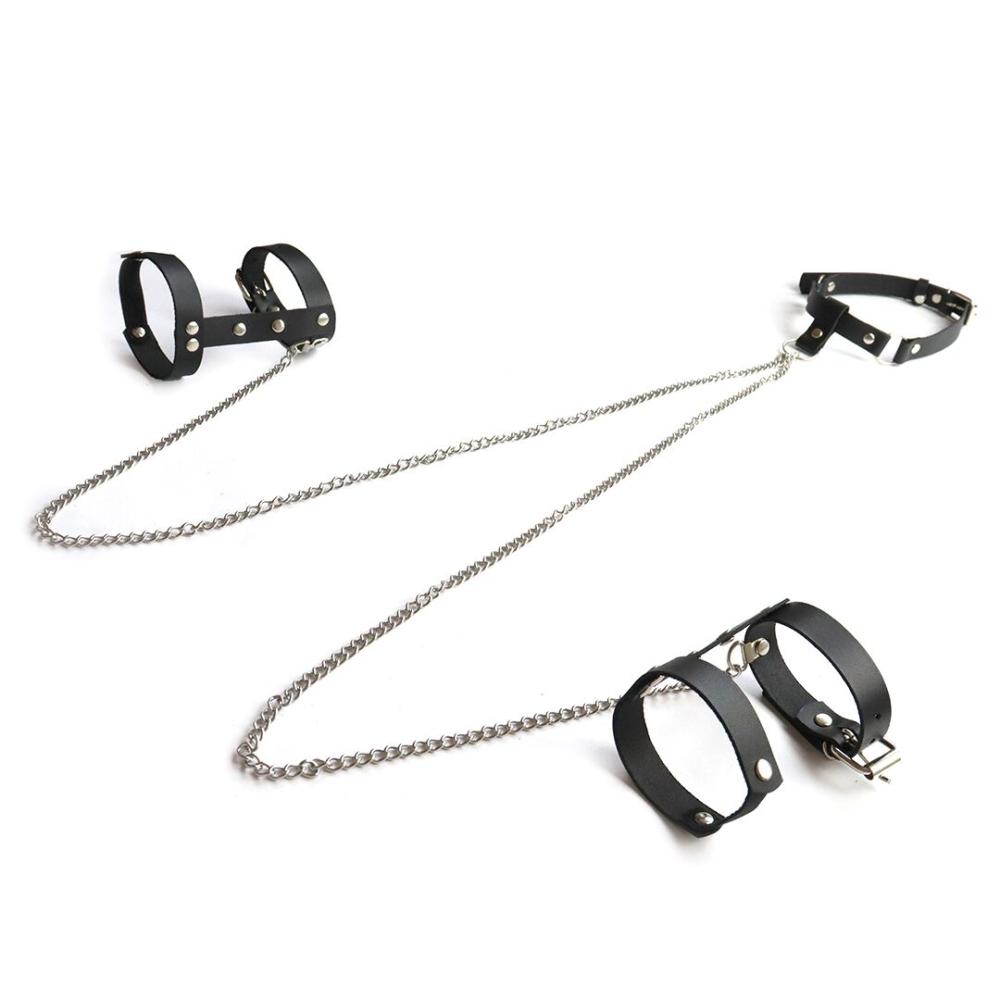 Ошейник из натуральной кожи с великолепным сочетанием в виде украшений для рук. Соединенные между собой тонкими металлическими цепочками, они будут идеально дополнять ваши игры с подчинением и доминацией. Украшения для рук - это имитация наручников, которая в этом случае более легкая, но обыграна на восточный мотив, и поэтому вызывает ассоциацию с рабынями-танцовщицами, заточенными в гареме. Как бы то ни было, благодаря этому девайсу, ваши БДСМ практики станут более разнообразными и интересными. Еще больше вариантов для получения наслаждения.