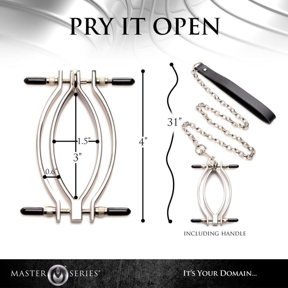 Зажим для половых губ Master Series Pussy Tugger Adjustable Vagina Clamp with Chain идеально подойдет для температурных игр. Опустите зажим в прохладную или теплую воду перед использованием и наблюдайте, как будет реагировать на разные варианты стимулирования ваш партнер.