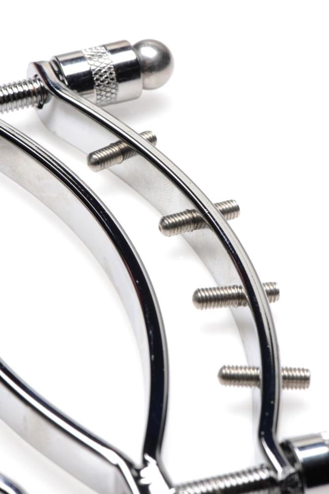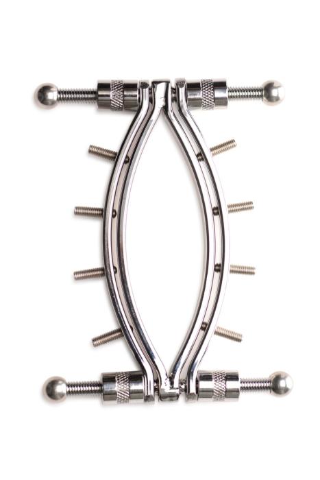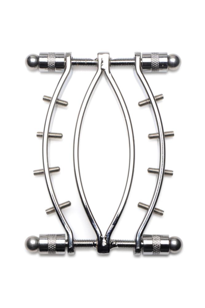 Зажим для вагины Master Series: Spread 'Em Poker Vagina Clamp with Adjustable Pressure Screws с шипами идеально подойдет для температурных игр. Опустите зажим в прохладную или теплую воду перед использованием и наблюдайте, как будет реагировать на разные варианты стимулирования ваш партнер.