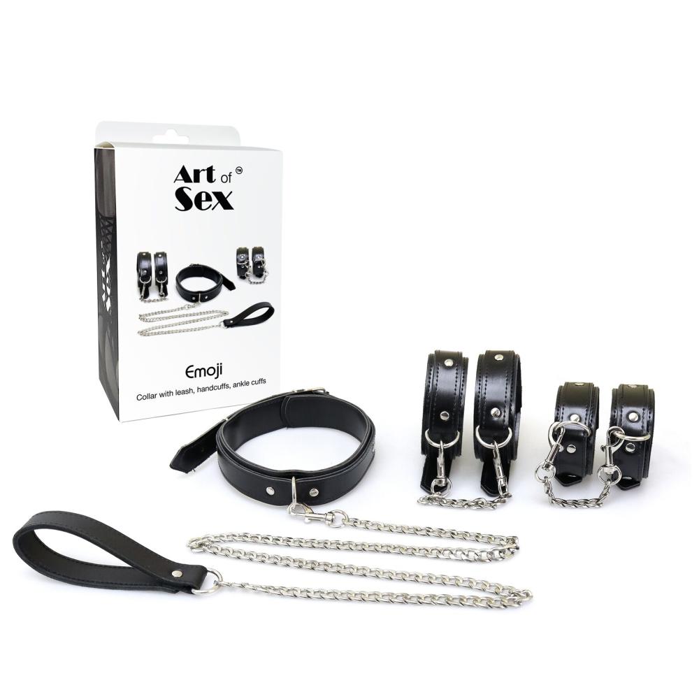 Оригинальный набор из трех элементов Art of Sex - Emoji: ошейника с поводком, наручников и поножей предназначен для тех, кто желает расширить свой опыт в интимных отношениях и ощутить невероятную смесь власти, страсти и приключений. Все элементы набора изготовлены из высококачественных материалов. Наручники и поножи обеспечивают мягкую поддержку и комфортное прилегание к запястьям и щиколоткам. Ошейник с металлическим поводком надежно фиксируется на шее и позволяет управлять движениями партнера. Регулируемые затяжные ремни позволяют вам настраивать степень фиксации для комфортного ношения на протяжении всей игры.