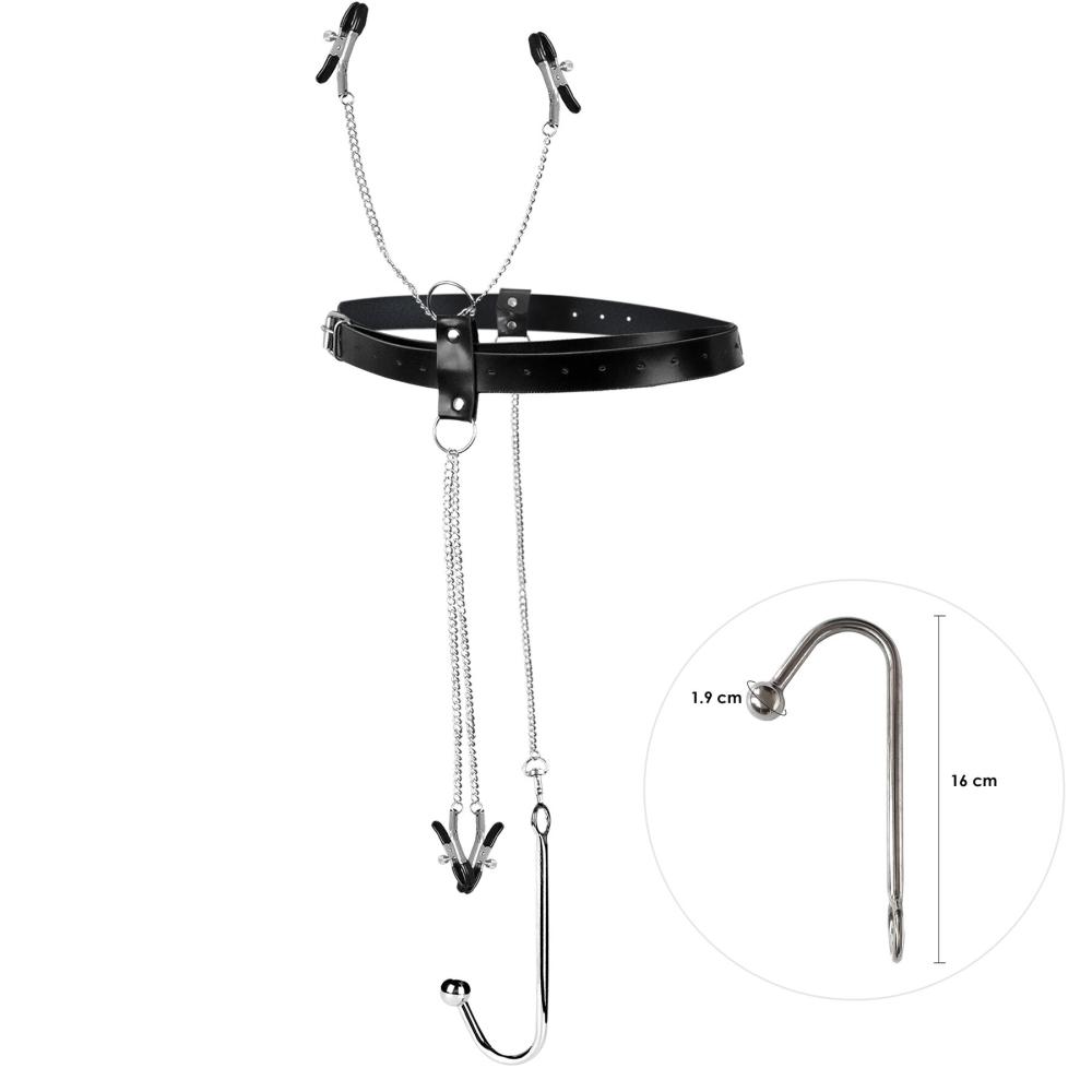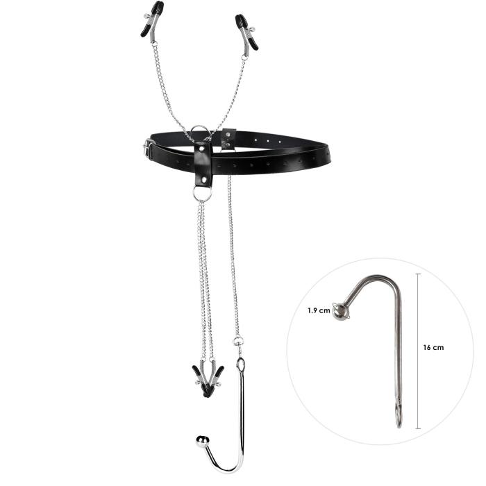 Анальный крюк, изготовленный из безопасного для тела и гладкого металла, позволяет вам открывать новые грани сексуального удовольствия и ощущений. Зажимы для сосков и половых губ, объединены между собой металлической цепочкой и имеют механизмы для регуляции силы сжатия, чтобы менять ощущения в зависимости от личных предпочтений. Регулируемые ремни пояса обеспечивают идеальную посадку и комфорт использования.